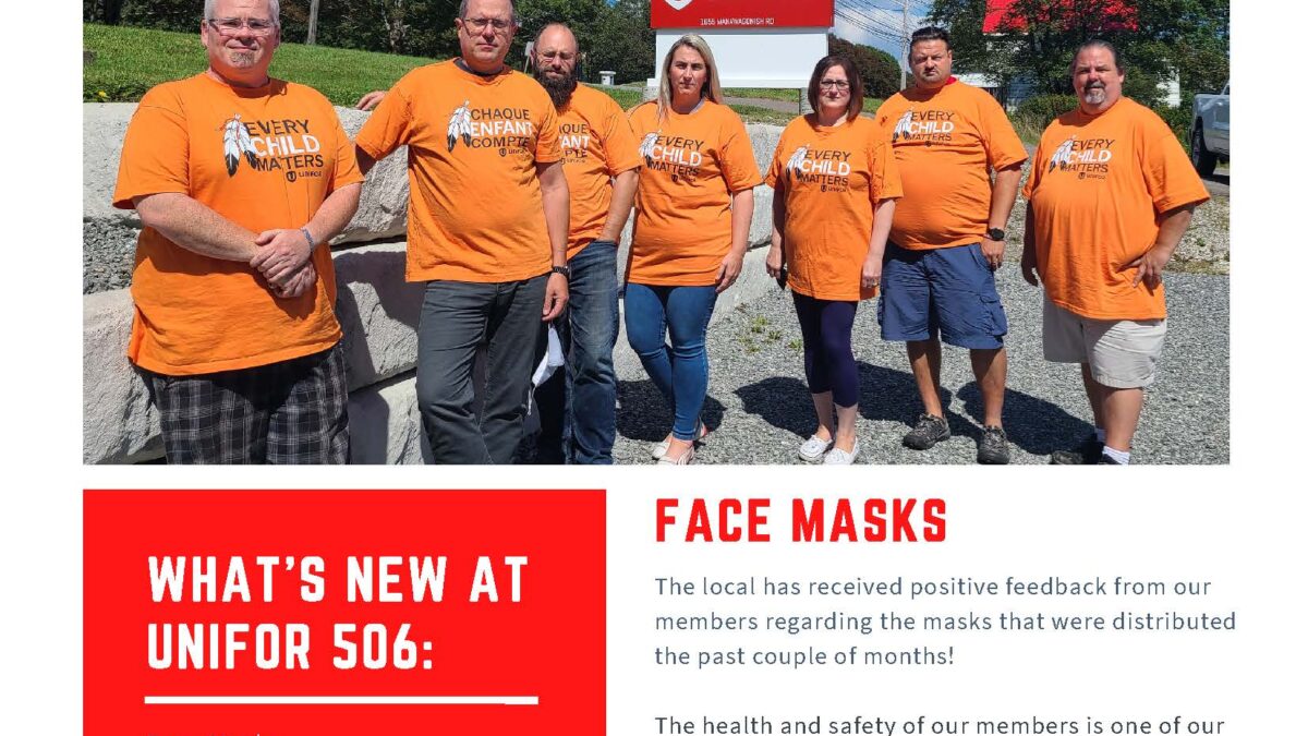The health and safety of our members is one of our highest priorities. If any members would like another mask, we still have some available at the union office; please send your request to unionoffice@unifor506.ca.