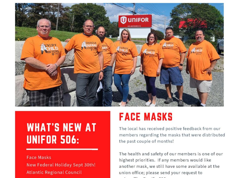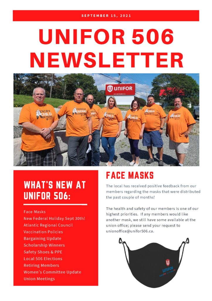 Click link for Newsletter in PDF format… https://unifor506-alt.panchroma.dev/wp-content/uploads/2021/09/Unifor-506-Bulletin-Updated-Sept-16-RED.pdf Face Masks The Local has received positive feedback from our members regarding the masks that were distributed the […]