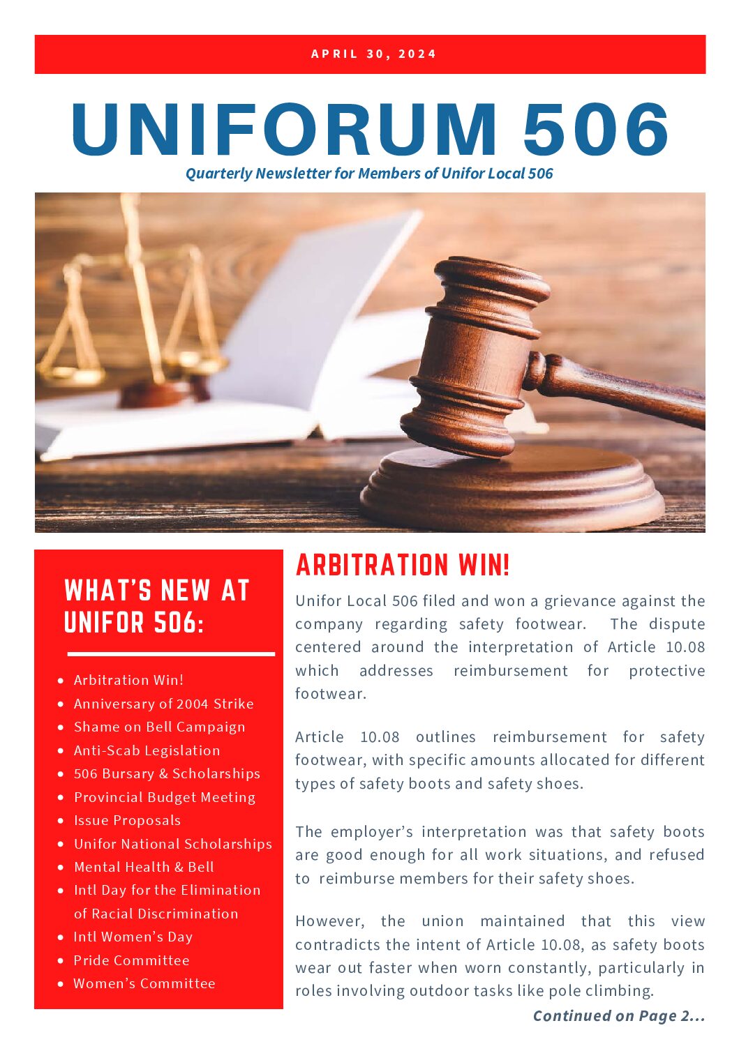 Click here to view Newsletter in PDF Format. What’s new at Unifor 506: Arbitration Win! Anniversary of 2004 Strike Shame on Bell Campaign Anti-Scab Legislation 506 […]