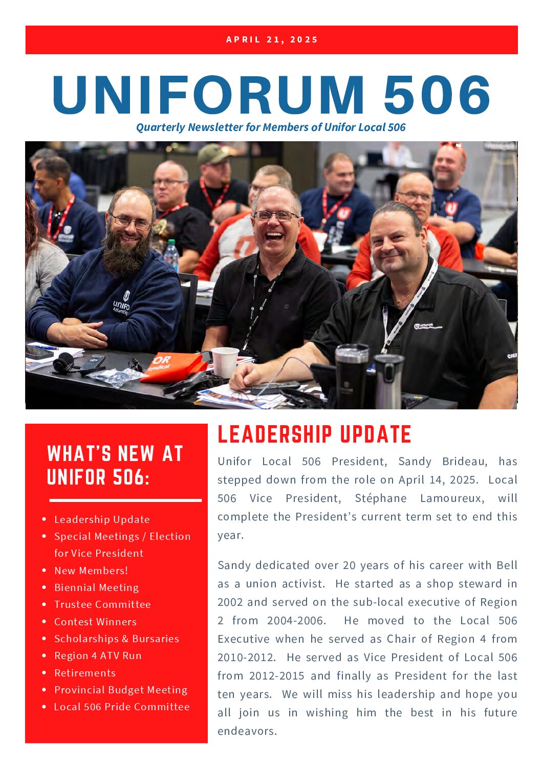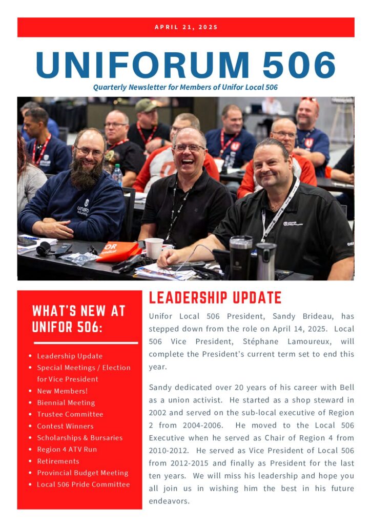 Click Here to view Newsletter in PDF Format. What’s new at Unifor 506: Leadership Update Special Meetings / Election for Vice President New Members! Biennial Meeting […]